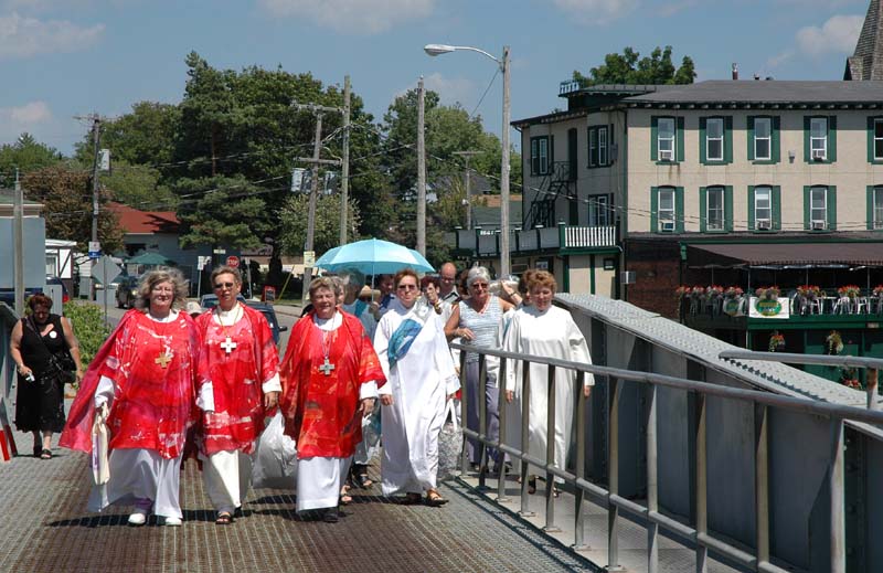 Berichte zur WEIHE 2005 IN CANADA, veranstaltet von der Gruppe ROMANCATHOLIC WOMENPRIESTS PHOTOS Diakoninnen- und Priesterinnenweihe am 25. Juli 2005 in Gananoque, St.Lawrence-River, Canada, auf einem Schiff: Die Bischöfinnen und die Kandidatinnen auf dem Weg zum Schiff von links nach rechts: Dr. Gisela Forster, Christine Mayr-Lumetzberger, Dr. Patricia Fresen, Victoria Rue (mit Schirm), Marie David, Michele Birch-Conery, Regina Nicolosi, Kathy Vandenberg