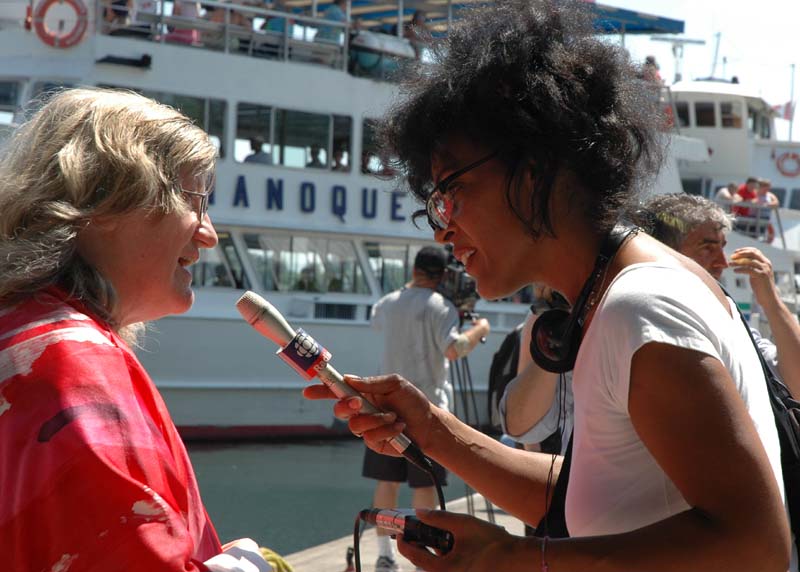 Im Hintergrund das Schiff "Gananoque-Thousand Islands". Vorne Dr.Gisela Forster spricht über die Ordination für die französischen Sender von Canada