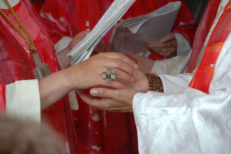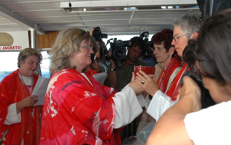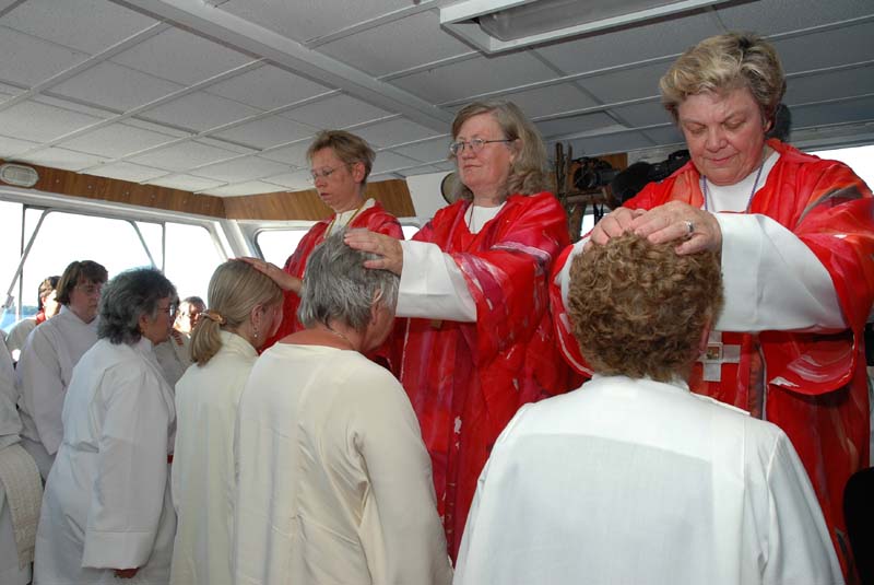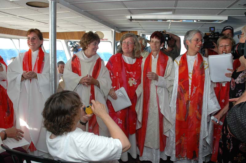 Priesterinnen und Priester der verschiedenen christlichen Kirchen von links: John Smith, Dr. Ida Raming, Jim David, Dr. Patricia Fresen, Dr. Iris Müller, Bill Manseau, Marie-Lynn, Dagmar Celeste, Christine Mayr-Lumetzberger Dr. Gisela Forster vorne liegend die Diakoninnen