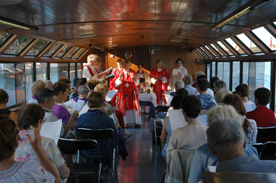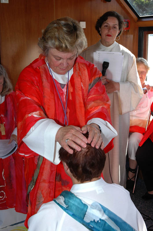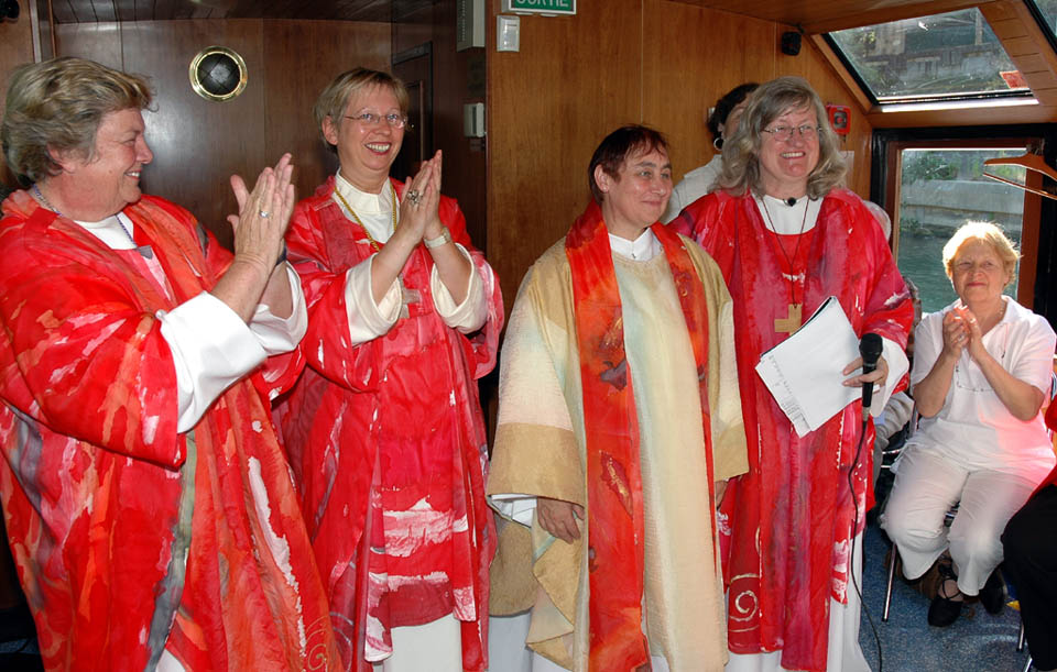Berichte zur PRIESTERINNENWEIHE 2005 LYON PHOTOS Priesterinnenweihe von Genevieve Benney am 2. Juli 2005 in Lyon auf einem Schiff auf der Saone. von links nach rechts: Dr. Patricia Fresen, Christine Mayr-Lumetzberger, Genevieve Benney, Dr. Gisela Forster